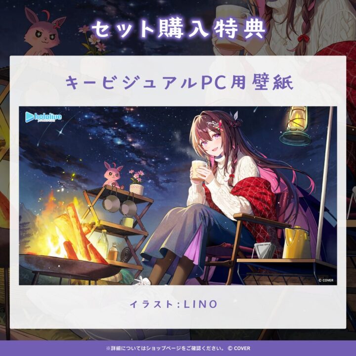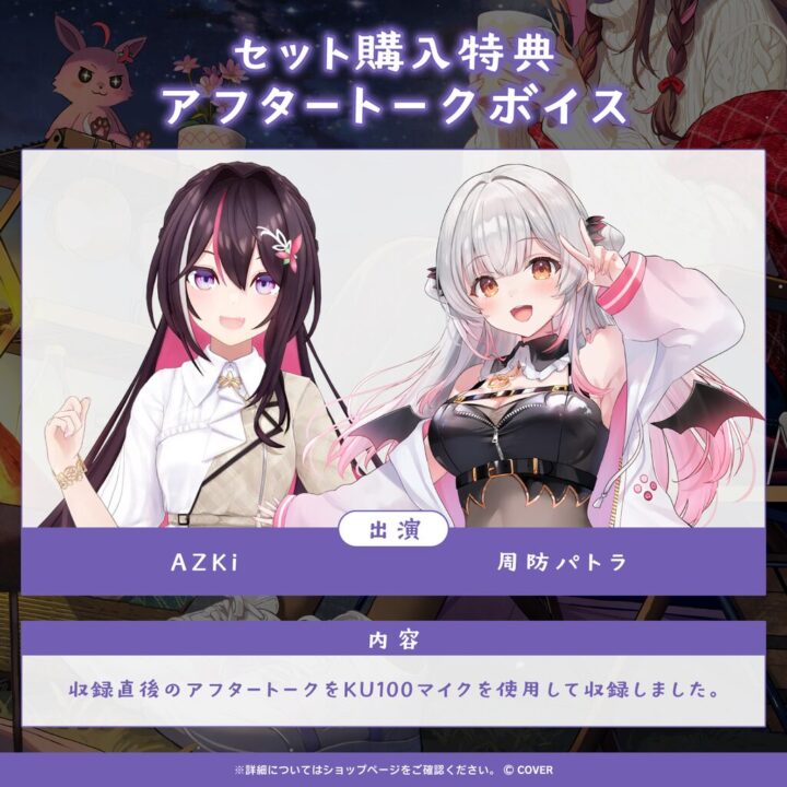 - ■「AZKi『癒しの高原キャンプ』ASMRボイス」フルセット ・ボイス 3種 ・特典:キービジュアルPC用壁紙(サイズ:1920×1080px) ・特典:アフタートークボイス(出演:AZKi、周防パトラ)