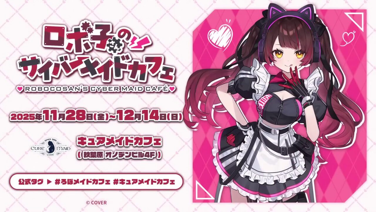 ホロライブ0期生・ロボ子さんが、秋葉原のキュアメイドカフェでコラボカフェと、ファンミーティングイベントを開催すると発表しました。