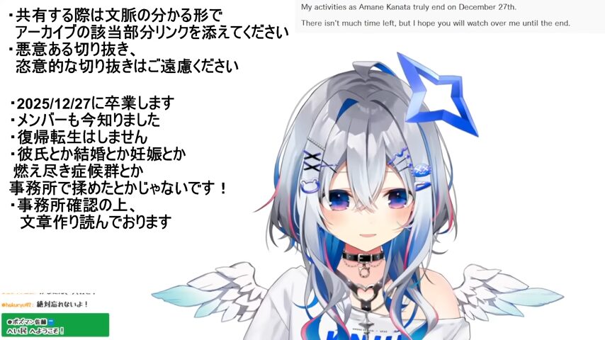 2025年12月2日にホロライブ4期生・天音かなたさんが、2025年12月27日で卒業すると発表しました。