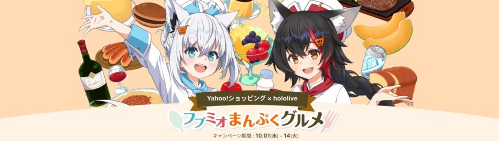 2025年10月1日、ホロライブ所属の白上フブキさんと大神ミオさんが、Yahoo!ショッピングとのコラボキャンペーン「フブミオまんぷくグルメ」を開始しました。