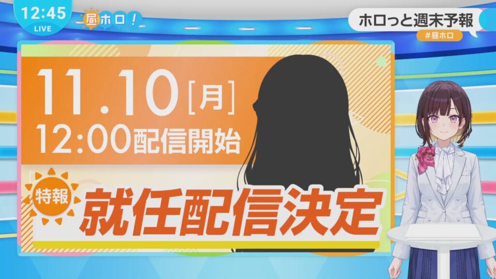 「ホロっと週末予報」では、ベスティア・ゼータさんの生誕ライブの予定 と、11月10日にデビューする新アナウンサーの就任配信について告知されています。