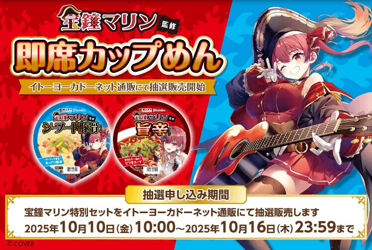イトーヨーカドーネット通販限定で「宝鐘マリン特別セット」が抽選販売され、カップめんと限定描き下ろしグッズがセットになった内容です。