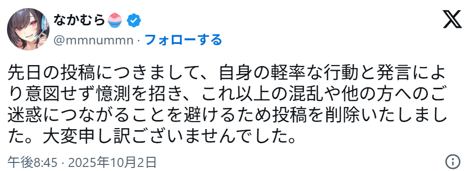2025年10月2日になかむら氏が先日の投稿について謝罪しました。