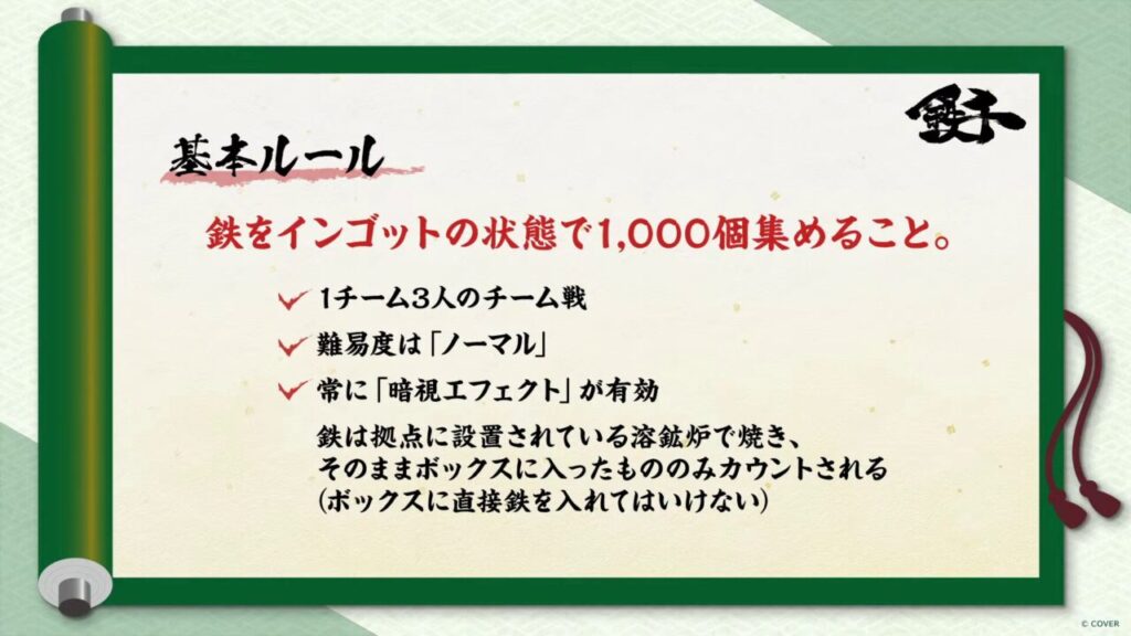 形式1チーム3人による対抗戦(最速で鉄インゴット1000個を集めたチームが勝利)