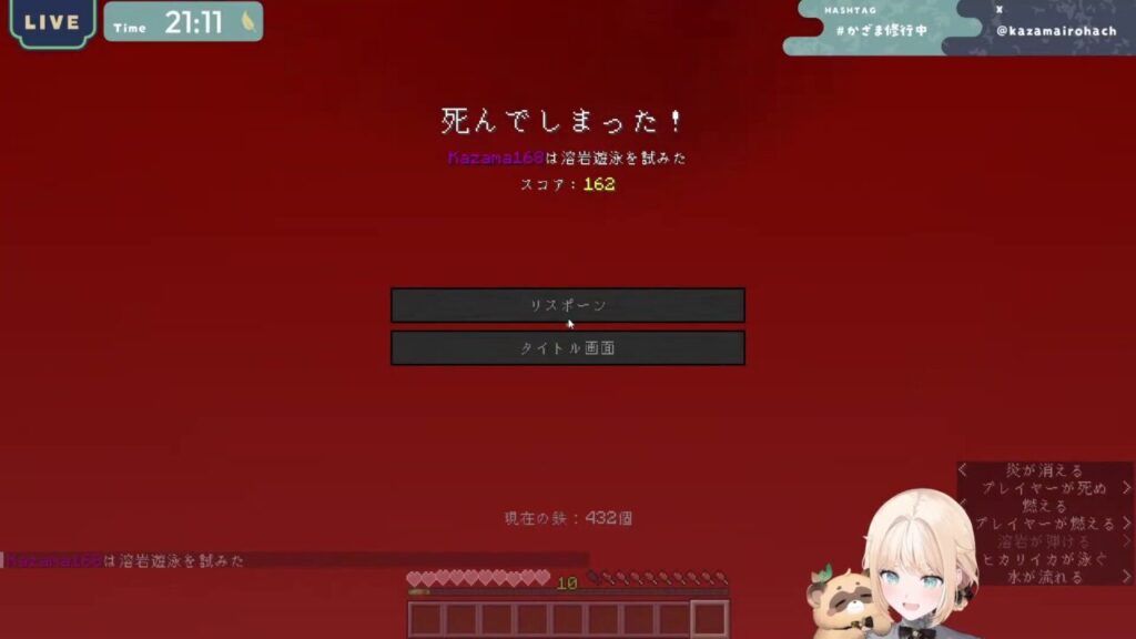 さらにマグマへ転落し、所持していた鉄鉱石と装備をすべて失う“全ロス”という展開に見舞われました。