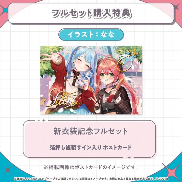 - 特典:セット詳細 ■新衣装記念フルセット ・グッズ4種 ・特典:さくらみこ&星街すいせい箔押し複製サイン入り「なな書き下ろし ポストカード」