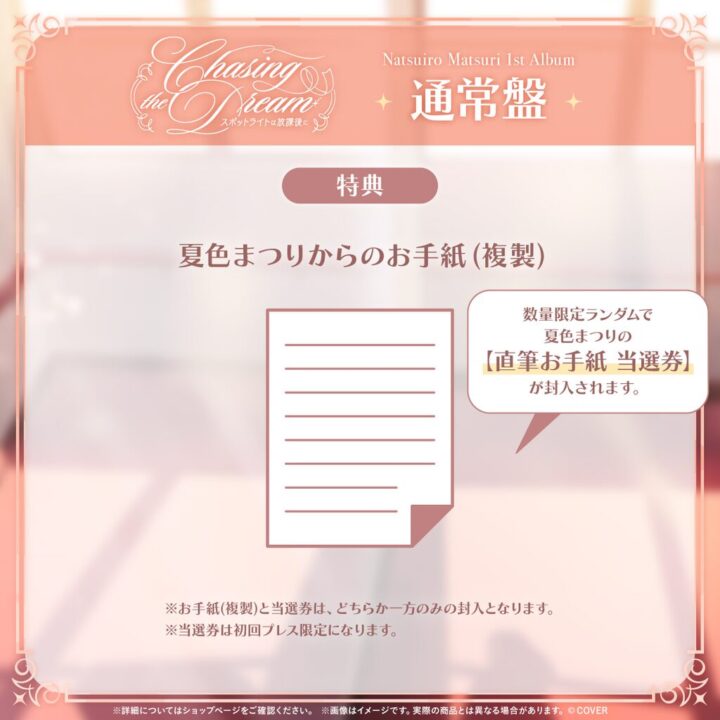 加えて、数量限定ランダムで「直筆お手紙 当選券」が封入される場合があり、お手紙(複製)と当選券は、どちらか一方のみの封入となります。