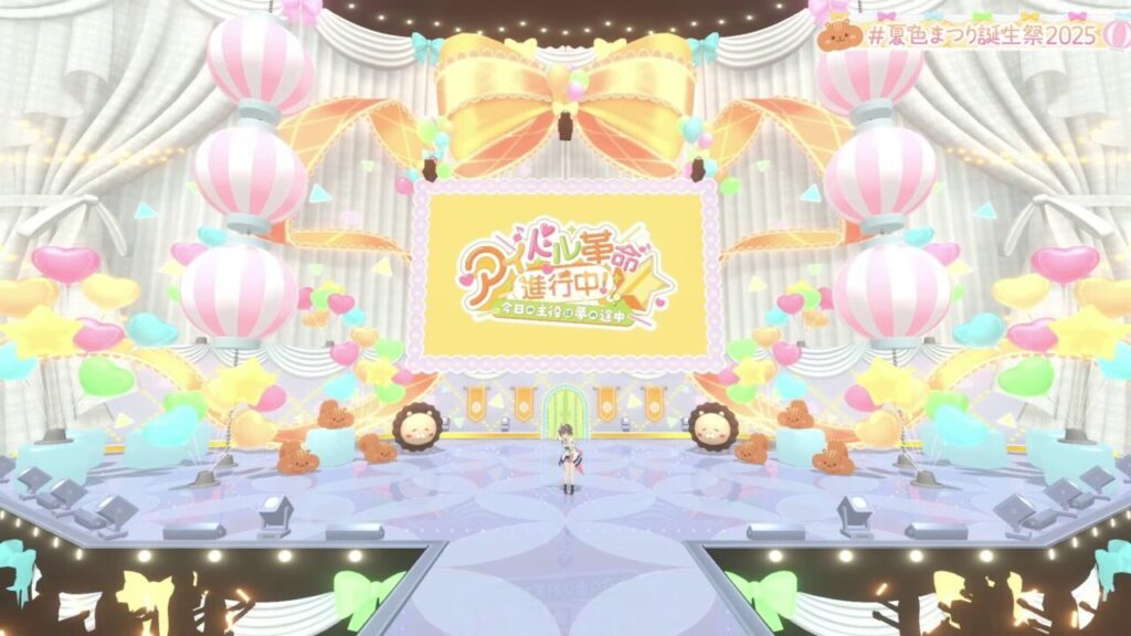 ステージセットは、パステルピンクを中心としたかわいらしい色味でまとめ、提灯や風船の演出を加えることで、画面上でもアイドルイベントらしい雰囲気を維持していました。