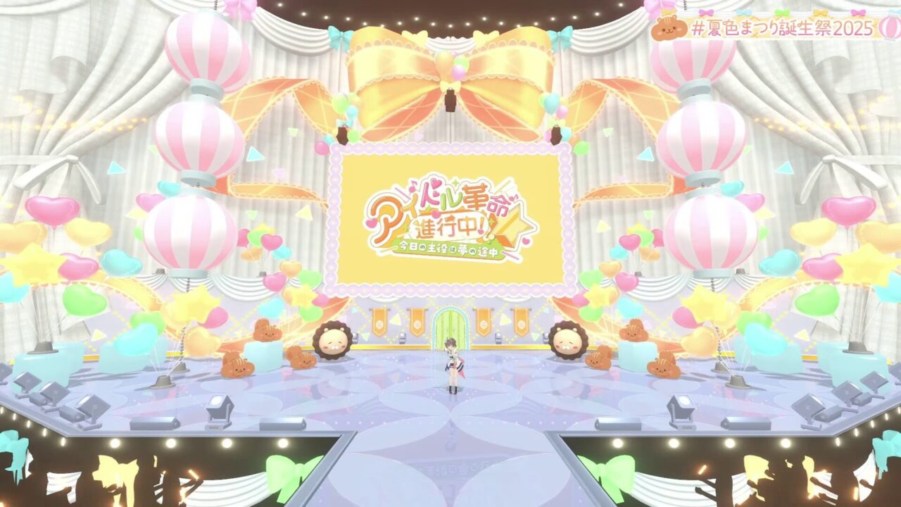 ステージはピンクを基調としたアイドルステージ風の装飾でまとめられ、提灯や色が変化する風船など、配信映えを意識した演出が行われています。